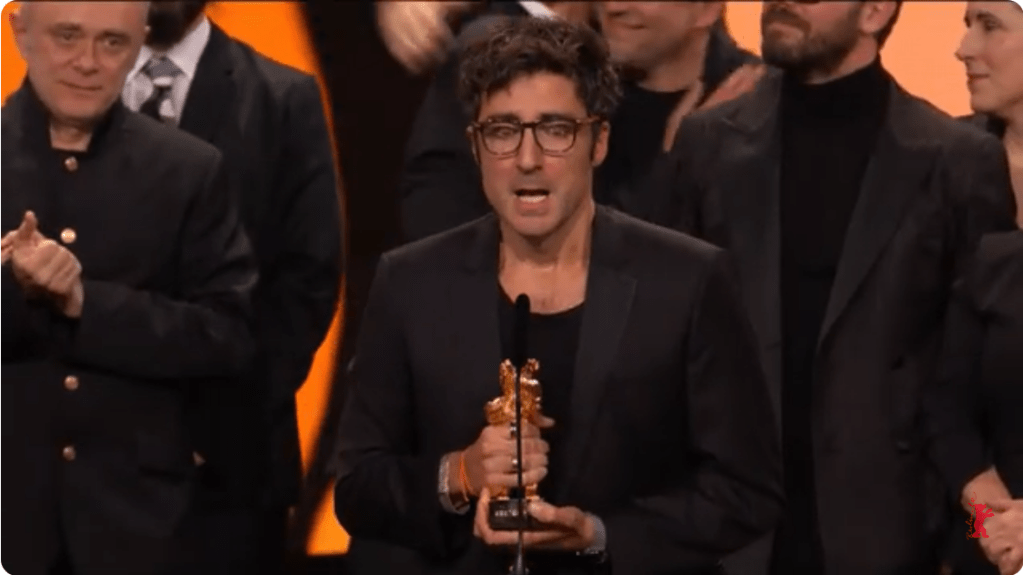 (Director İlker Çatak accepting Berlinale’s Golden Bear award for his film “Gelbe Briefe”)